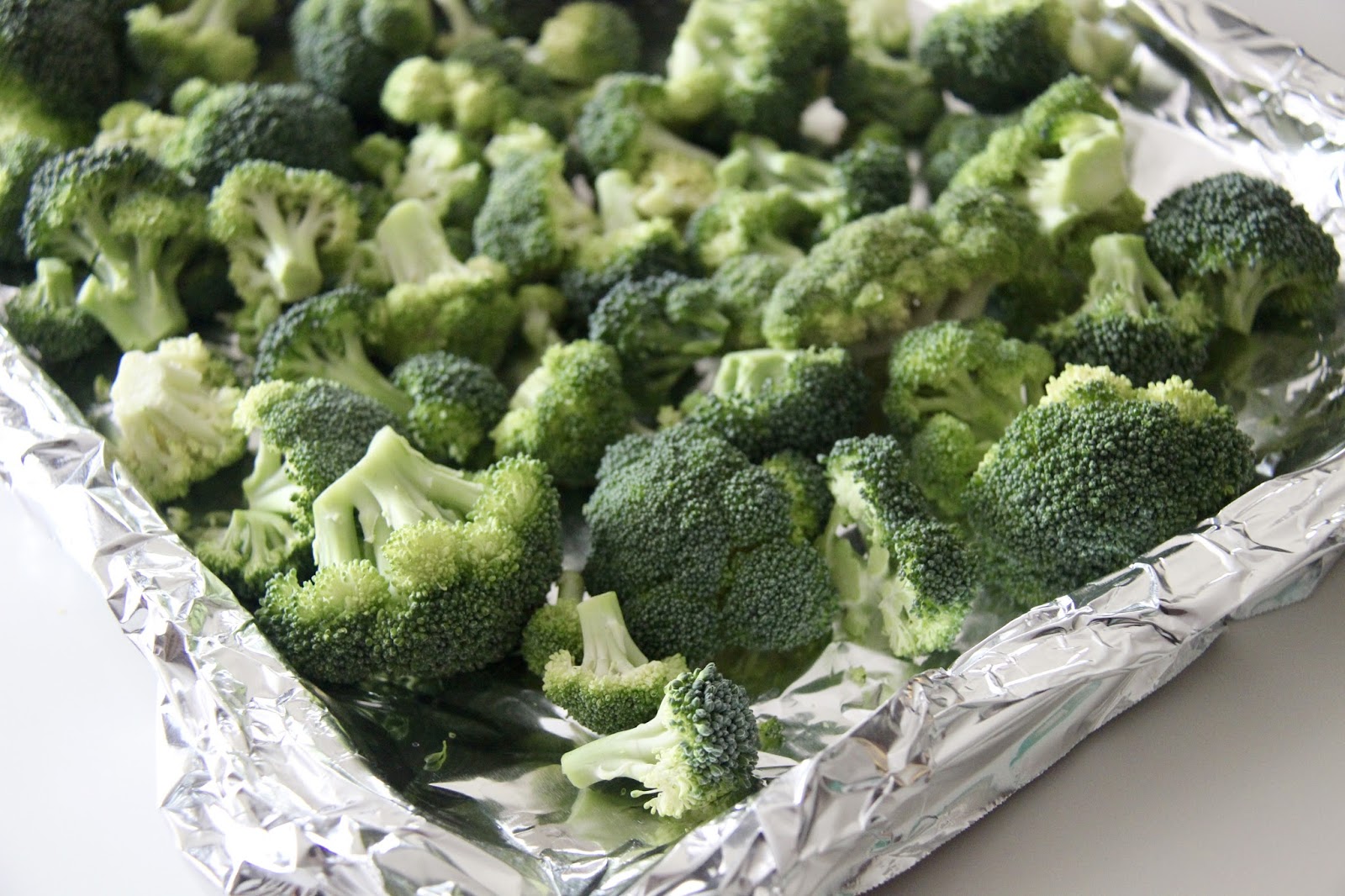 3.Place broccoli florets onto a baking sheet.Trim larger florets into smaller bite-sized pieces.